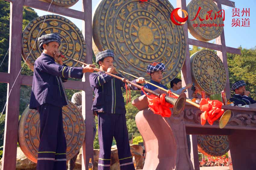 Nearly 10,000 Buyi people (an ethnic group living in south China) in national costumes danced together in Ceheng county, southwest China’s Guizhou province on Nov. 29, 2014. A certifier from the Guinness World Record granted the certificate “Buyi bamboo drum dance and Zhuanchang dance Guinness world record” to this dance after the performance. (Photo source: gz.people.cn)