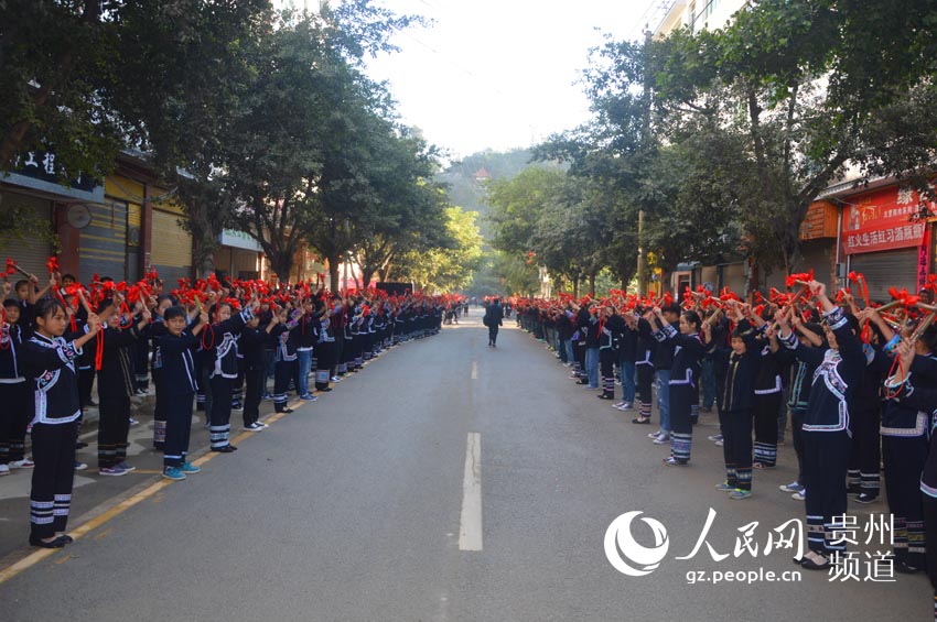 Nearly 10,000 Buyi people (an ethnic group living in south China) in national costumes danced together in Ceheng county, southwest China’s Guizhou province on Nov. 29, 2014. A certifier from the Guinness World Record granted the certificate “Buyi bamboo drum dance and Zhuanchang dance Guinness world record” to this dance after the performance. (Photo source: gz.people.cn)