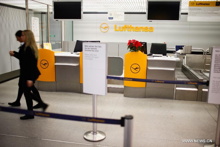 Two staff members walk by Lufthansa's check-in desks in Tegel airport, Berlin, Germany, on Dec. 1, 2014. German airline Lufthansa said on Monday that it had canceled nearly half of its scheduled flights on Monday and Tuesday due to a strike by its pilots. (Xinhua/Zhang Fan)