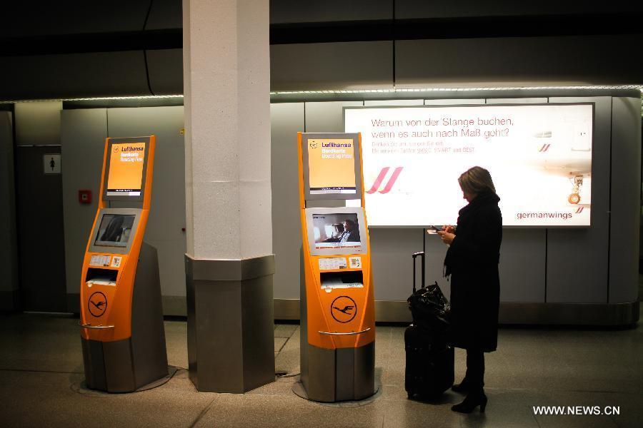 A passenger stands near Lufthansa's automatic machines in Tegel airport, Berlin, Germany, on Dec. 1, 2014. German airline Lufthansa said on Monday that it had canceled nearly half of its scheduled flights on Monday and Tuesday due to a strike by its pilots. (Xinhua/Zhang Fan)