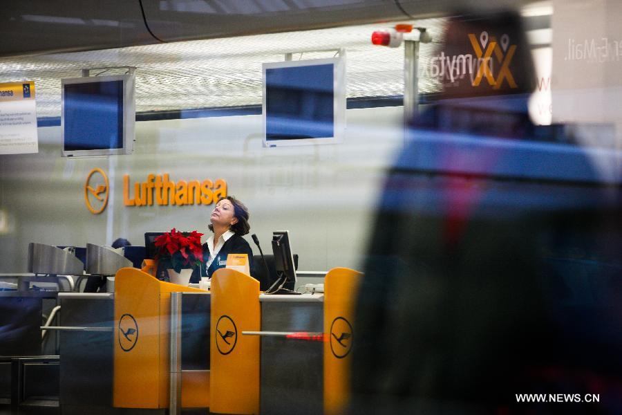 A staff member waits at Lufthansa's check-in desk in Tegel airport, Berlin, Germany, on Dec. 1, 2014. German airline Lufthansa said on Monday that it had canceled nearly half of its scheduled flights on Monday and Tuesday due to a strike by its pilots. (Xinhua/Zhang Fan)