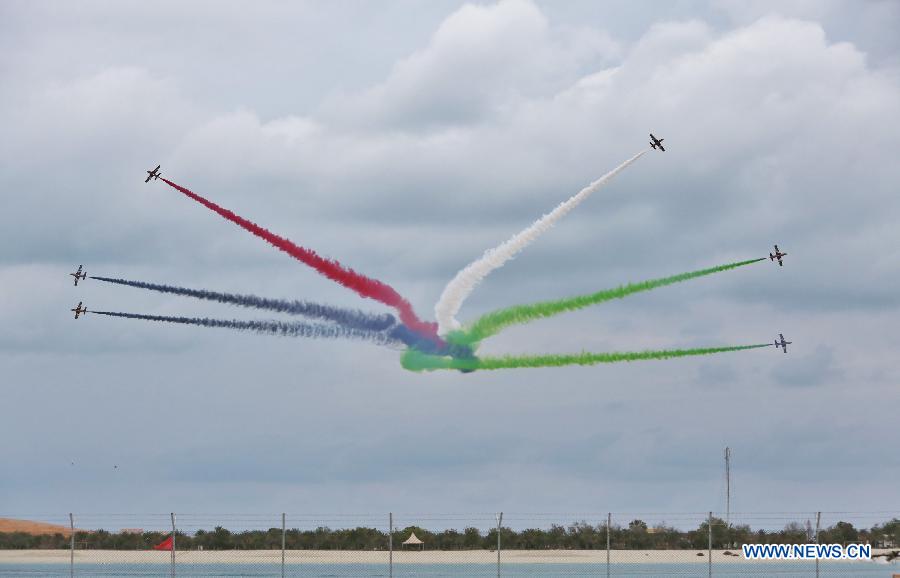 The UAE Aerobatic Display Team "Knights" perform during a military show to celebrate the 43rd anniversary of the founding of the United Arab Emirates (UAE) in Abu Dhabi, capital of the UAE, on Dec. 1, 2014. The UAE greets its national foundation day on Dec. 2 annualy. (Xinhua/An Jiang)