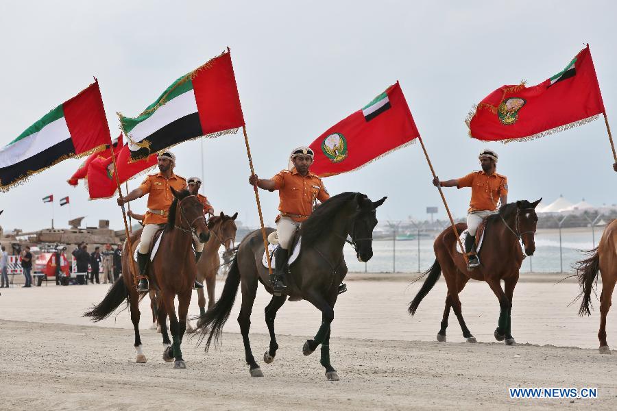 Honour guards riding horses pass the reviewing stand during a military show to celebrate the 43rd anniversary of the founding of the United Arab Emirates (UAE) in Abu Dhabi, capital of the UAE, on Dec. 1, 2014. The UAE greets its national foundation day on Dec. 2 annualy. (Xinhua/An Jiang)