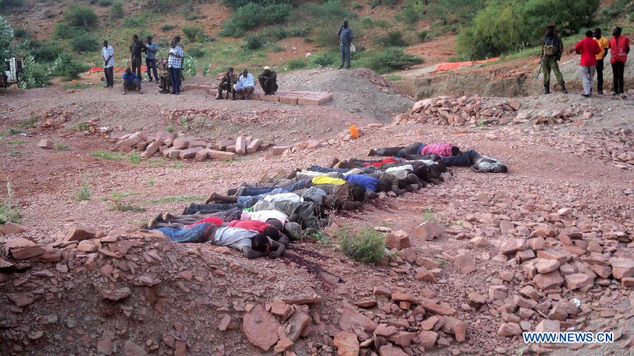 Bodies of victims are seen at a quarry at Koromey area in the outskirts of Mandera town, Kenya, Dec. 2, 2014. Kenyan presidential spokesman Manoah Esipisu said Tuesday heavily armed bandits raided a quarry workers' camp at Koromey at around 2 a.m., killing 36 people. (Xinhua/Fabian Mangera)