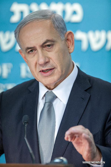 Israeli Prime Minister Benjamin Netanyahu speaks during a press conference at his office in Jerusalem, Dec. 2, 2014. Israeli Prime Minister Benjamin Netanyahu announced his support for dispersing the Knesset (parliament) and conducting early elections amid a coalition crisis. Netanyahu also said he has ordered to fire Justice Minister Tzipi Livni and Finance Minister Yair Lapid, who he said plotted against him by outspokenly criticizing his policies. (Xinhua/JINI)