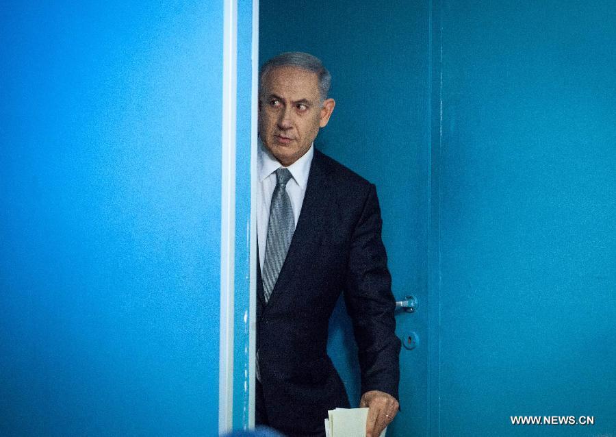 Israeli Prime Minister Benjamin Netanyahu arrives at a press conference at his office in Jerusalem, Dec. 2, 2014. Israeli Prime Minister Benjamin Netanyahu announced his support for dispersing the Knesset (parliament) and conducting early elections amid a coalition crisis. Netanyahu also said he has ordered to fire Justice Minister Tzipi Livni and Finance Minister Yair Lapid, who he said plotted against him by outspokenly criticizing his policies. (Xinhua/JINI)