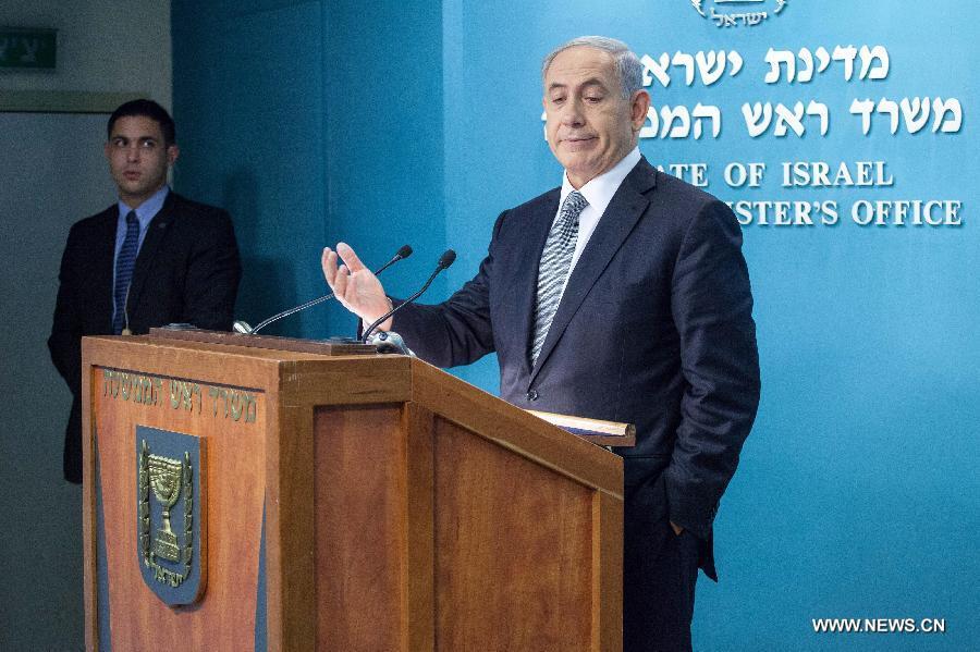 Israeli Prime Minister Benjamin Netanyahu gestures while speaking during a press conference at his office in Jerusalem, Dec. 2, 2014. Israeli Prime Minister Benjamin Netanyahu announced his support for dispersing the Knesset (parliament) and conducting early elections amid a coalition crisis. Netanyahu also said he has ordered to fire Justice Minister Tzipi Livni and Finance Minister Yair Lapid, who he said plotted against him by outspokenly criticizing his policies. (Xinhua/JINI)