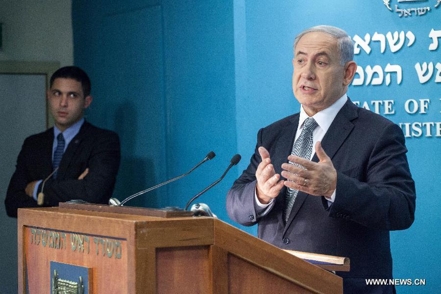 Israeli Prime Minister Benjamin Netanyahu speaks during a press conference at his office in Jerusalem, Dec. 2, 2014. Israeli Prime Minister Benjamin Netanyahu announced his support for dispersing the Knesset (parliament) and conducting early elections amid a coalition crisis. Netanyahu also said he has ordered to fire Justice Minister Tzipi Livni and Finance Minister Yair Lapid, who he said plotted against him by outspokenly criticizing his policies. (Xinhua/JINI)