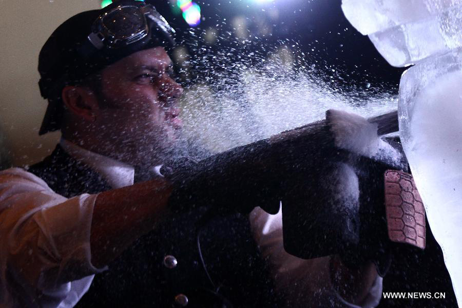 | Max Zuleta of Ice Beat Factory uses a chainsaw to create an ice sculpture at a mall in Quezon City, the Philippines, Dec. 3, 2014. Ice Beat Factory mixes music and sculpting in its performances. (Xinhua/Rouelle Umali) |