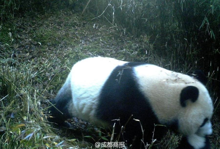 | Photo taken by an infrared camera shows a wild panda who grabs a cub by the neck with teeth walking in bamboo forest in Jiuzhaigou, or Jiuzhai Valley, located in the Aba Tibetan and Qiang autonomous prefecture of northwestern Sichuan province. Local wildlife protection office said on Tuesday that it is the first time to shoot a wild panda and its cub at the same time. [Photo: Sina Weibo account of Chengdu Business Daily] |