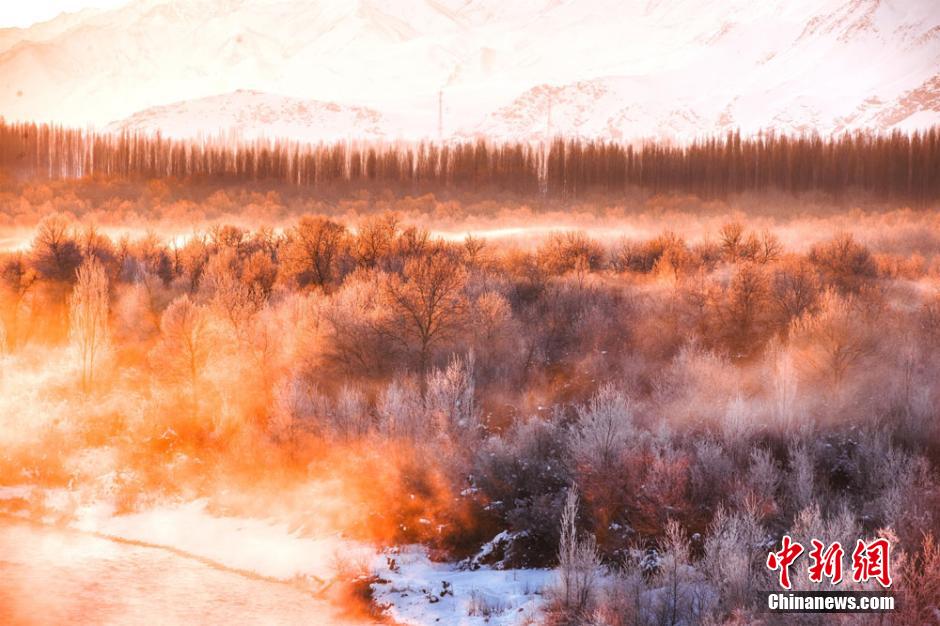 The beautiful secondary forest is shrouded by winter mist at the Kashgar River Valley in Nilka county, northwest China’s Xinjiang Uyghur autonomous region on Dec 1, 2014. With the mist still lingering around, part of the secondary forest sparkles in winter sunshine at the Kashgar River Valley in Nilka county, northwest China’s Xinjiang Uyghur autonomous region. The secondary forest in Nilka, the largest and best-reserved in Asia, covers an area of 210,000 hectares and extends 100 kilometers. The Kashgar River Valley is home to a great diversity of animals and plants. (China News Service/Chen Hualin)