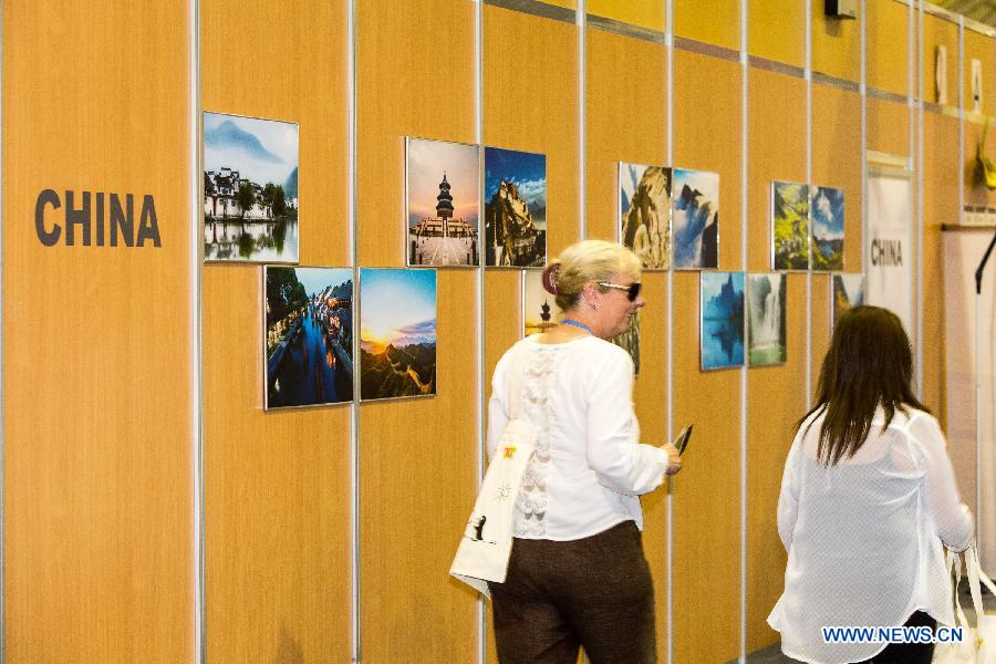 Pedestrains walk past a wall of photos of Chinese landscapes at the China Pavilion during the UN Climate Change Conference in Lima, capital of Peru, Dec. 3, 2014. The activities in China Pavilion, which kicks off on Dec.5, will present 17 events including forums and press conferences featuring China's efforts and achievements in addressing the climate change. (Xinhua/Xu Zijian)