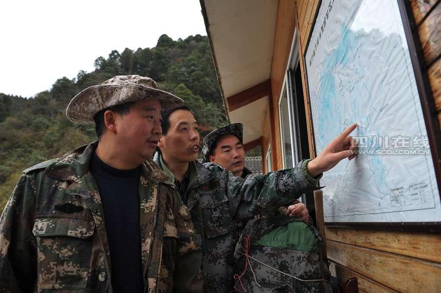Fu Qiang (middle) points out the patrol route and camping site.(Photo/SCOL.com.cn)