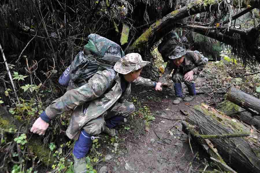Rangers help each other to walk through narrow paths in the forest.(Photo/SCOL.com.cn)