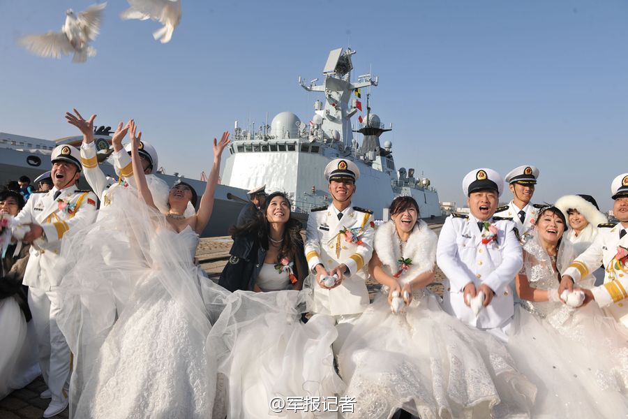 A collective wedding is held at a naval base of the North Sea Fleet for 18 soldiers who are going to execute escort mission in Gulf of Aden on Dec. 1, 2014. (Photo/Weibo of Liberation Army Daily)