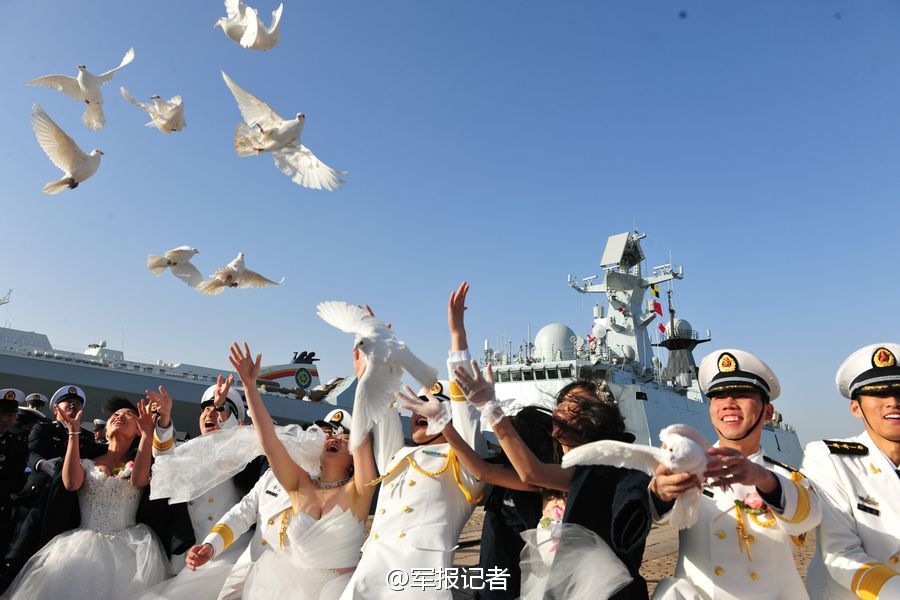 A collective wedding is held at a naval base of the North Sea Fleet for 18 soldiers who are going to execute escort mission in Gulf of Aden on Dec. 1, 2014. (Photo/Weibo of Liberation Army Daily)