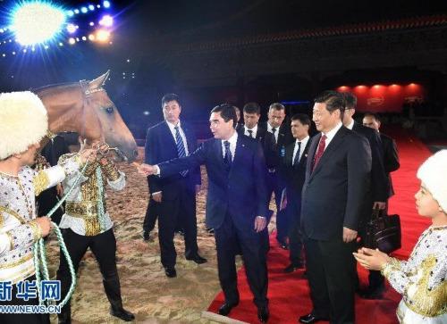 Chinese President Xi Jinping (2nd R, front) receives an Akhal-Teke horse presented by his Turkmenistan counterpart Gurbanguly Berdymukhamedov during the opening ceremony of the International Akhal-Teke Horses Association Special Conference and China Horse Culture Festival in Beijing, May 12, 2014. Akhal-Teke, nicknamed "blood-sweating horse" in China, is one of the world's oldest and most unique breeds from Turkmenistan.