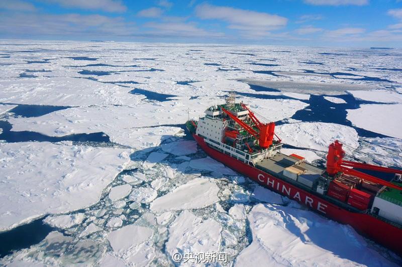 China's 31st Antarctic expedition unloads goods near the Antarctic ice sheet as a crowd of penguins gather around it. On Dec.4, 2014, Chinese research vessel and icebreaker Xuelong (Snow Dragon) set off from Shanghai on the country's 31st Antarctic expedition. It is scheduled to return in next April. (Photo/CCTV News official microblog)