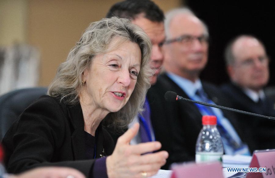 Jo Ivey Boufford, representative of InterAcademy Medical Panel, speaks at the Urban Health and Wellbeing - International Programme Meeting in Xiamen, southeast China's Fujian Province, Dec. 9, 2014. About 60 experts attended the meeting of Urban Health and Wellbeing International Programme held by International Council for Science (ICSU), InterAcademy Medical Panel and United Nations University at the Institute of Urban Environment of Chinese Academy of Science on Tuesday. (Xinhua/Lin Shanchuan)