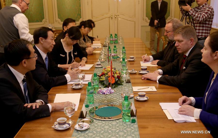Slovak Prime Minister Robert Fico meets with Wang Jiarui, visiting vice chairman of the National Committee of the Chinese People's Political Consultative Conference (CPPCC) and Head of the International Relations Department of the Communist Party of China Central Committee, in Bratislava, Slovak Republic, Dec. 8, 2014. (Xinhua/Erik Adamson)