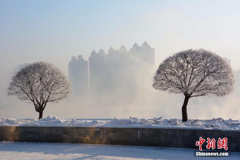 Dense fog shrouds the Songhua River in Jilin city, northeast China's Jilin province on Dec. 8, 2014. Linjiangmen Bridge and buildings on the banks of the river shrouded in fog loom up like a mirage. (CNS/Wang Mingming)