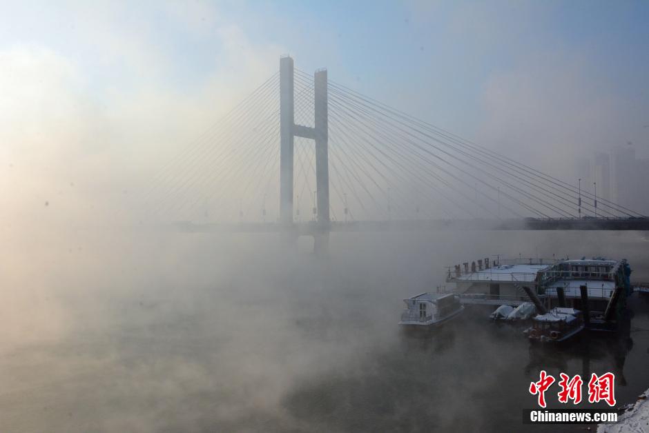 Dense fog shrouds the Songhua River in Jilin city, northeast China's Jilin province on Dec. 8, 2014. Linjiangmen Bridge and buildings on the banks of the river shrouded in fog loom up like a mirage. (CNS/Wang Mingming)