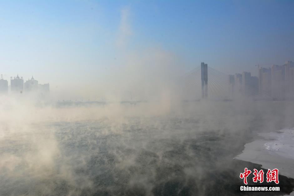 Dense fog shrouds the Songhua River in Jilin city, northeast China's Jilin province on Dec. 8, 2014. Linjiangmen Bridge and buildings on the banks of the river shrouded in fog loom up like a mirage. (CNS/Wang Mingming)