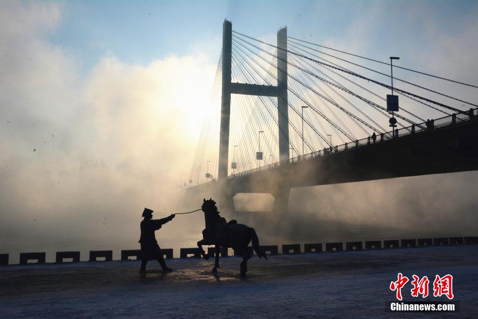 Dense fog shrouds the Songhua River in Jilin city, northeast China's Jilin province on Dec. 8, 2014. Linjiangmen Bridge and buildings on the banks of the river shrouded in fog loom up like a mirage. (CNS/Wang Mingming)