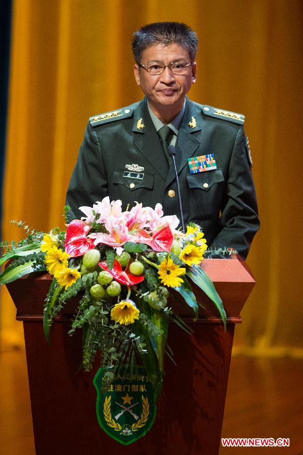 Wang Wen, commander of the Chinese People's Liberation Army (PLA) Garrison in Macao Special Administrative Region, addresses the meeting to celebrate the 15th anniversary of the deployment in Macao of the PLA Garrison in Macao, south China, on Dec. 9, 2014. (Xinhua/Cheong Kam Ka)