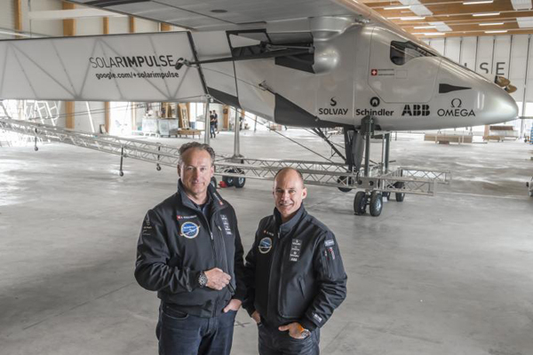 André Borschberg and Bertrand Piccard in front of Solar Impulse. (Photo provided by Solar Impulse team)