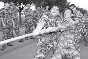 | Students and soldiers compete in a tug-of-war competition during a 2013 summer camp organized by the PLA garrison. Provided to China Daily |