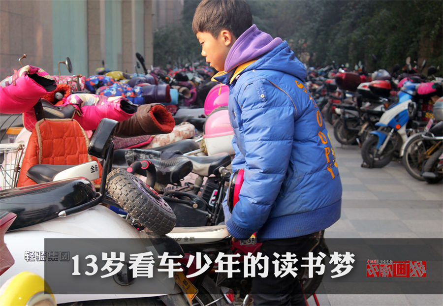 With the help of good-hearted people, they found a job at a bicycle parking lot. As long as he has spare time, Zhang will take out his textbook, with the hope of going back to school.