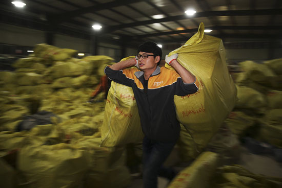 | An expressman lifting two big packages over his shoulder walks fast as if on wings(Photo/People.cn) |