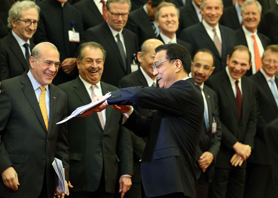 Chinese Premier Li Keqiang meets with the foreign delegates at the China Development Forum 2013 on March 25, 2013. Pointing to his watch, Li apologetically explained that he was delayed by the last foreign affairs activity.(Photo/People.cn)