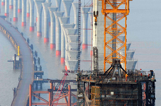 | Workers on the tower of Jiaxing-Shaoxing cross-sea bridge(Photo/People.cn) |