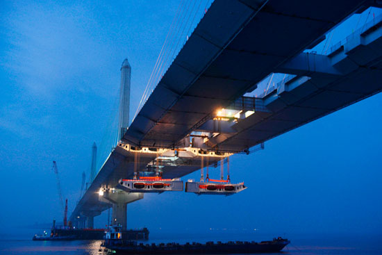 | The last two steel box girders of Jiaxing-Shaoxing cross-sea bridge are lifted into place.(Photo/People.cn) |