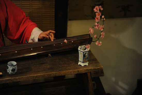 | Lv Chengfang plays the guqin, a seven-stringed Chinese musical instrument.(Photo/People.cn) |