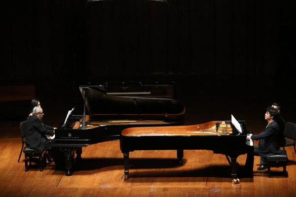 Gary Graffman (left) and Lang Lang (right) perform Johannes Brahms' Sonata for Two Pianos in F minor at a concert in Beijing's National Center for the Performing Arts on Nov 29.[Photo provided to China Daily]