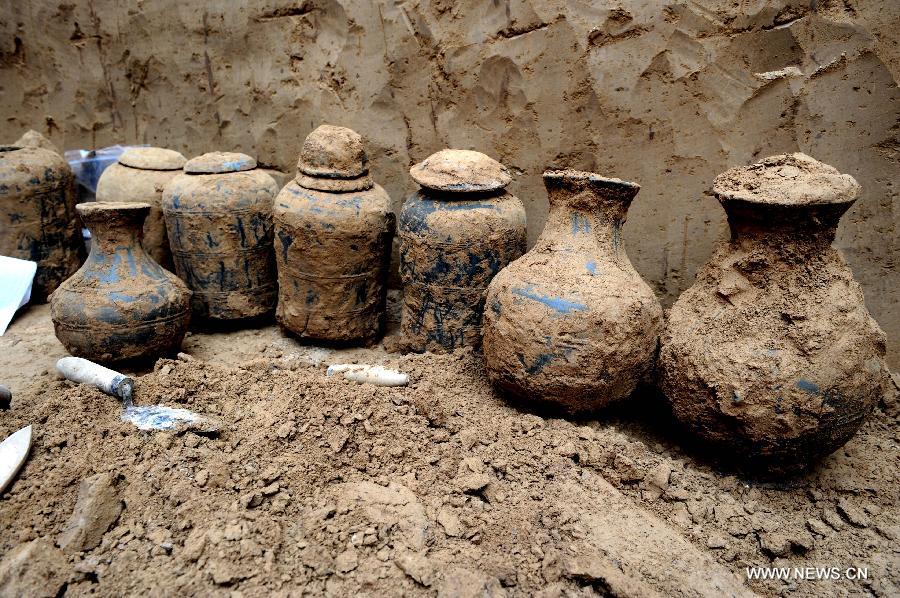 Photo taken on Dec. 11, 2014 shows pottery wares unearthed from graves at the excavating spot of ancient relics of the Han Dynasty (202 BC-220 AD), in Wenxian County, central China's Henan Province. (Xinhua/Zhu Xiang)