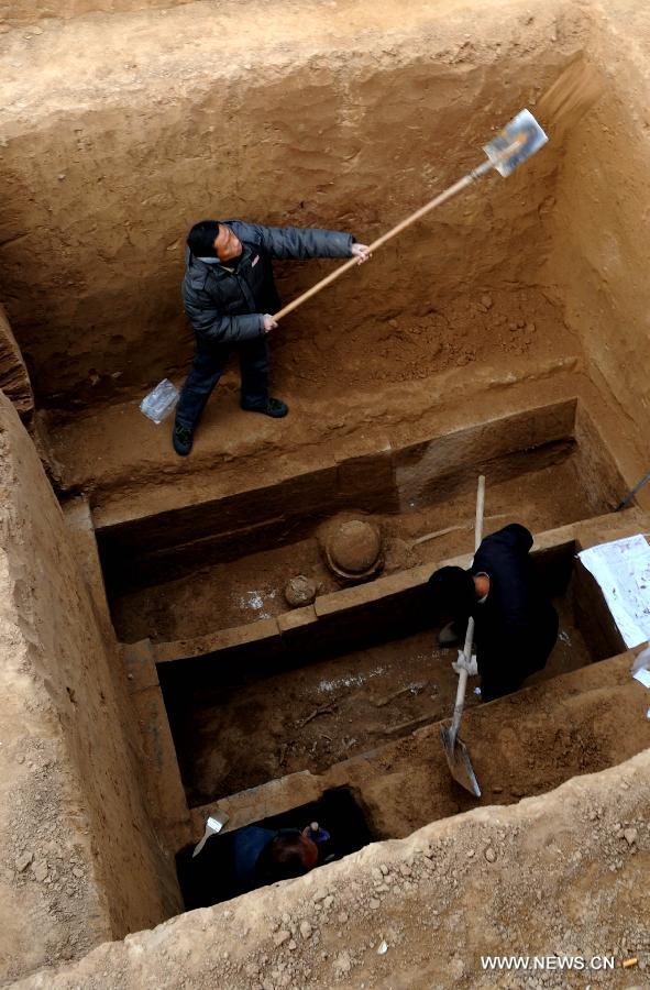 Archaeologists work in graves at the excavating spot of ancient relics of the Han Dynasty (202 BC-220 AD), in Wenxian County, central China's Henan Province, Dec. 11, 2014. (Xinhua/Zhu Xiang)