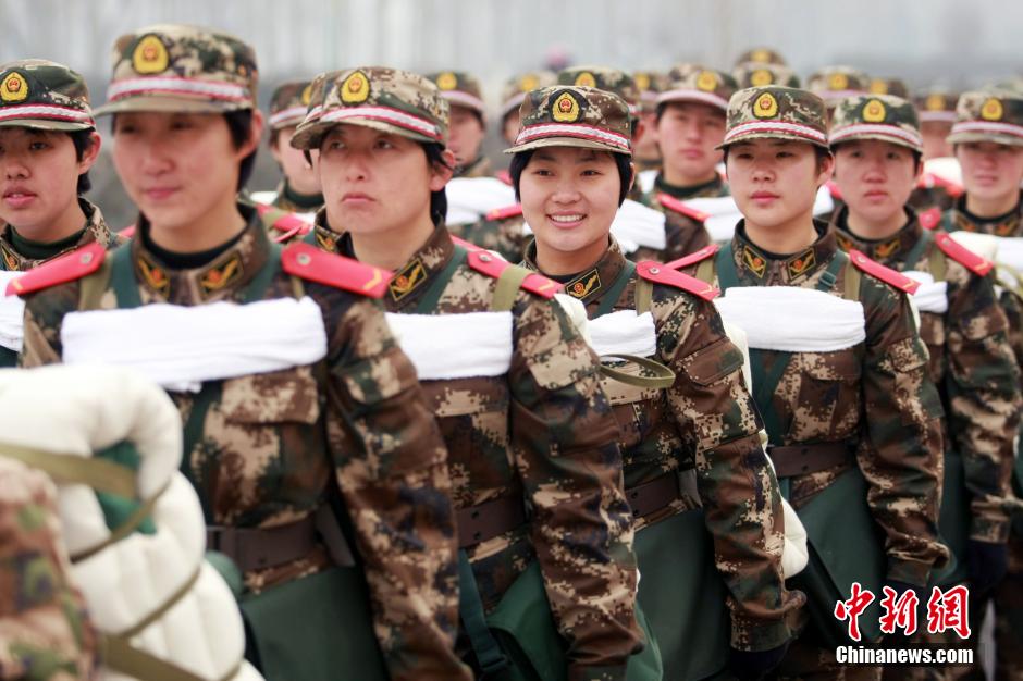 More than 3,000 new female recruits of Beijing Armed Police Force receive training in suburb of Beijing on Dec. 9, 2014. Training subjects include forced march, camping and military boxing in order to strengthen physical condition of the new recruits. (CNS/Yang Huifeng)