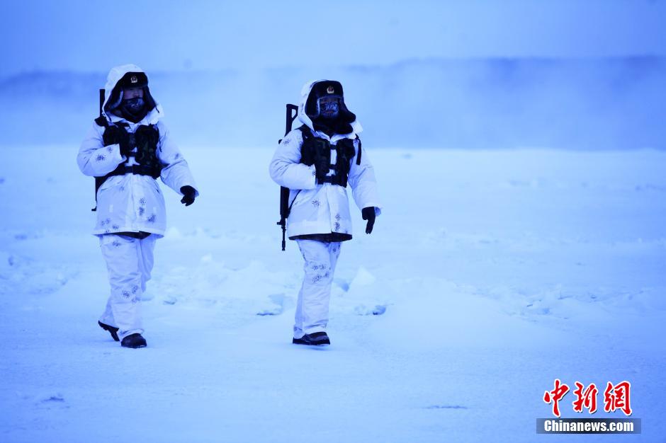 Xin Guoqiang and Zhang Bo, two sentries of the “Good Eighth Company in Heihe”, patrol at the China-Russia boundary river in severe cold of minus 32 degrees Celsius on Dec. 10, 2014. (Chinanews/Wei Jianshun)