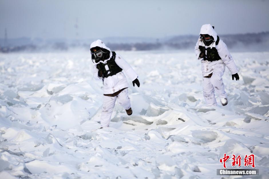 Xin Guoqiang and Zhang Bo, two sentries of the “Good Eighth Company in Heihe”, patrol at the China-Russia boundary river in severe cold of minus 32 degrees Celsius on Dec. 10, 2014. (Chinanews/Wei Jianshun)