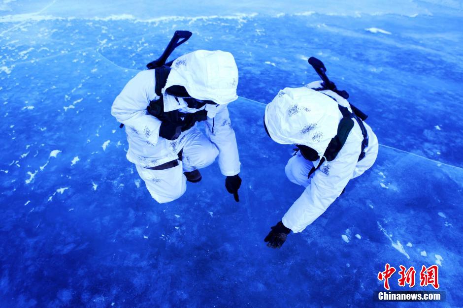 | Xin Guoqiang and Zhang Bo, two sentries of the “Good Eighth Company in Heihe”, patrol at the China-Russia boundary river in severe cold of minus 32 degrees Celsius on Dec. 10, 2014. (Chinanews/Wei Jianshun) |