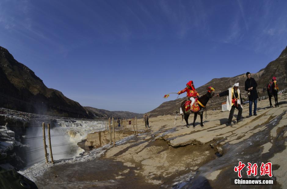 Silver thaw is formed along both sides of the Hukou waterfall of Huanghe River, north China's Shanxi province as temperature drops on Dec. 11, 2014. The spectacular scene of icefall and ice pillars attracted many tourists. (Chinanews/Rao Beicheng)