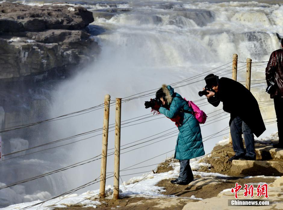 Silver thaw is formed along both sides of the Hukou waterfall of Huanghe River, north China's Shanxi province as temperature drops on Dec. 11, 2014. The spectacular scene of icefall and ice pillars attracted many tourists. (Chinanews/Rao Beicheng)