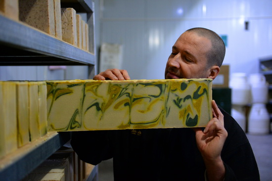 | Darren Moore checks the unique color patterns formed in the handmade soap. (Photo/ Huang Ying) |