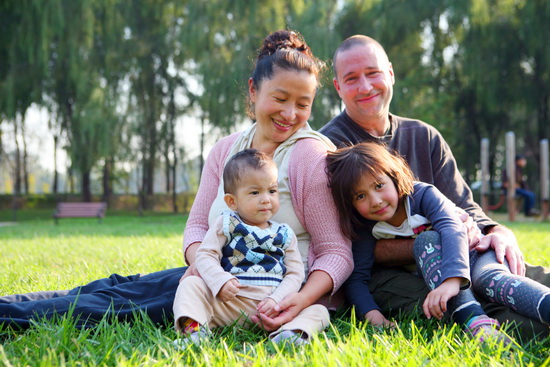 Canadian Darren Moore and his Chinese wife, Zhang Ping pose for a photo with their children. The couple has cultivated their "green dream” in Beijing. (Photo/ Huang Ying)