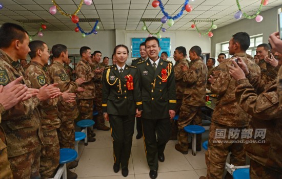 Zhang Bo and Liang Shunan walk towards the wedding hall amid applause.(mod.gov.cn)