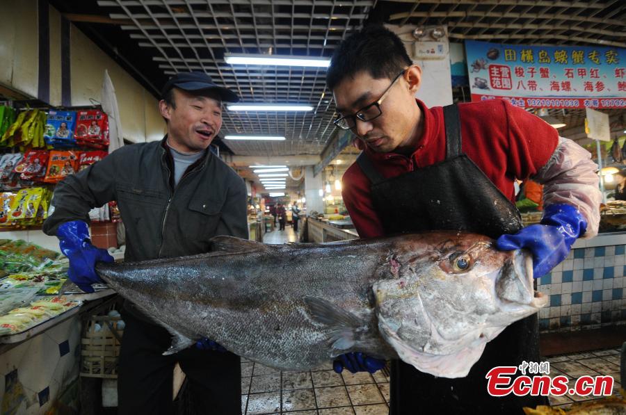 Two man carry a 1.46-meter-long, over-50-kilogram unknown fish in a food market in Qingdao, East China's Shandong province, Dec 14, 2014. Fishermen in Jiaozhou, a county-level city in Qingdao, caught this big unknown fish along with a rare 10-kilogram flatfish in Bohai Gulf on the morning of Dec 12. [Photo: China News Service/ Wang Haibin]